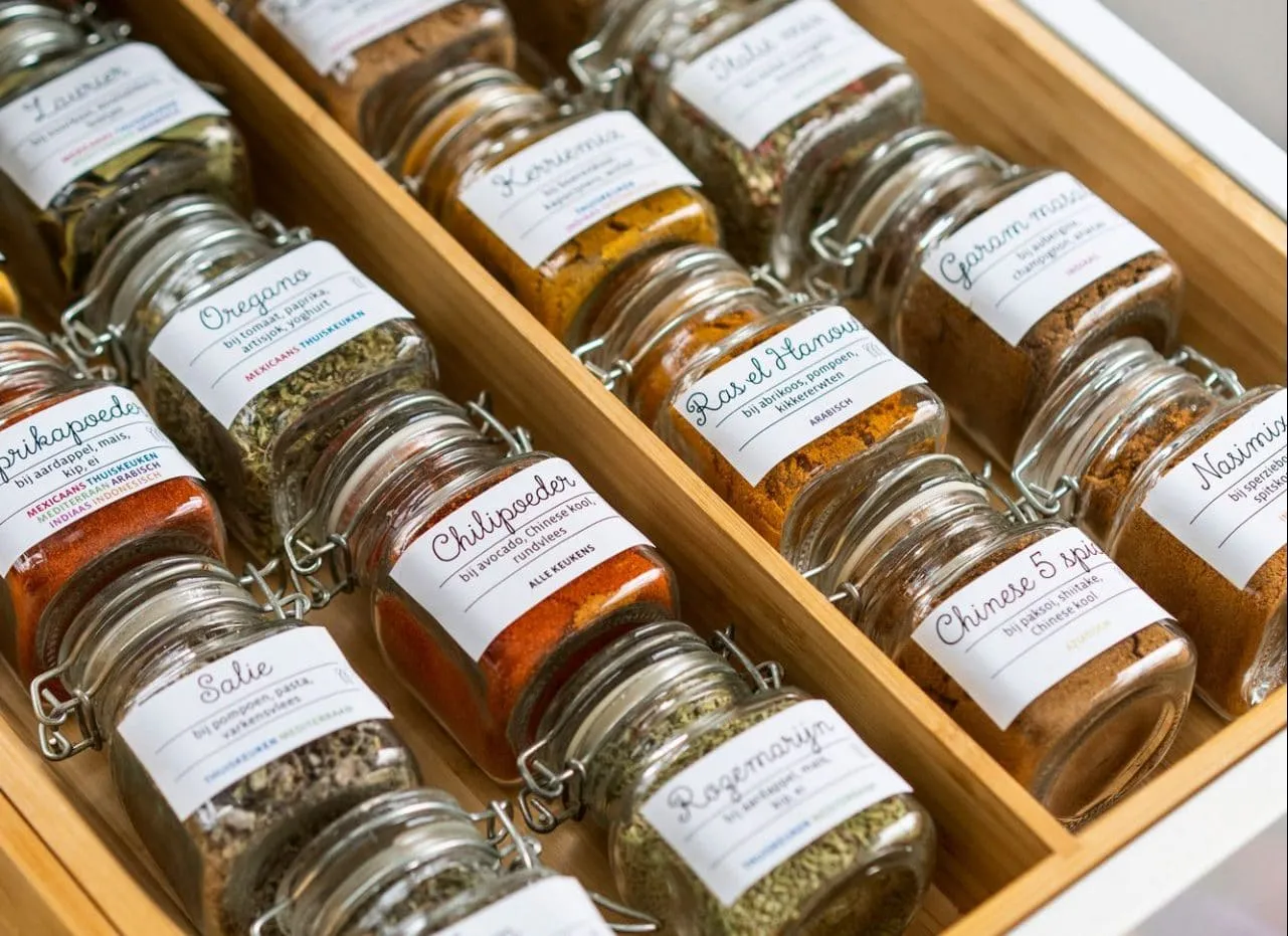 Ruim je huidige voorraad op. Gooi weg wat over de datum is. Koop 22 (weck)potten van verschillende formaten om alle losse items in te bewaren: elf middelgrote potten, tien grote potten en één lange pot voor spaghetti. Bestel de voorraadstickers in de shop en plak ze erop. Nog even boodschappen doen, de potten vullen en je bent klaar. Op deze manier richt je je keuken helemaal ‘receptloos’ in, waarna je alle gerechten uit mijn boek kunt maken zonder ooit nog ongebruikte flesjes over te houden.